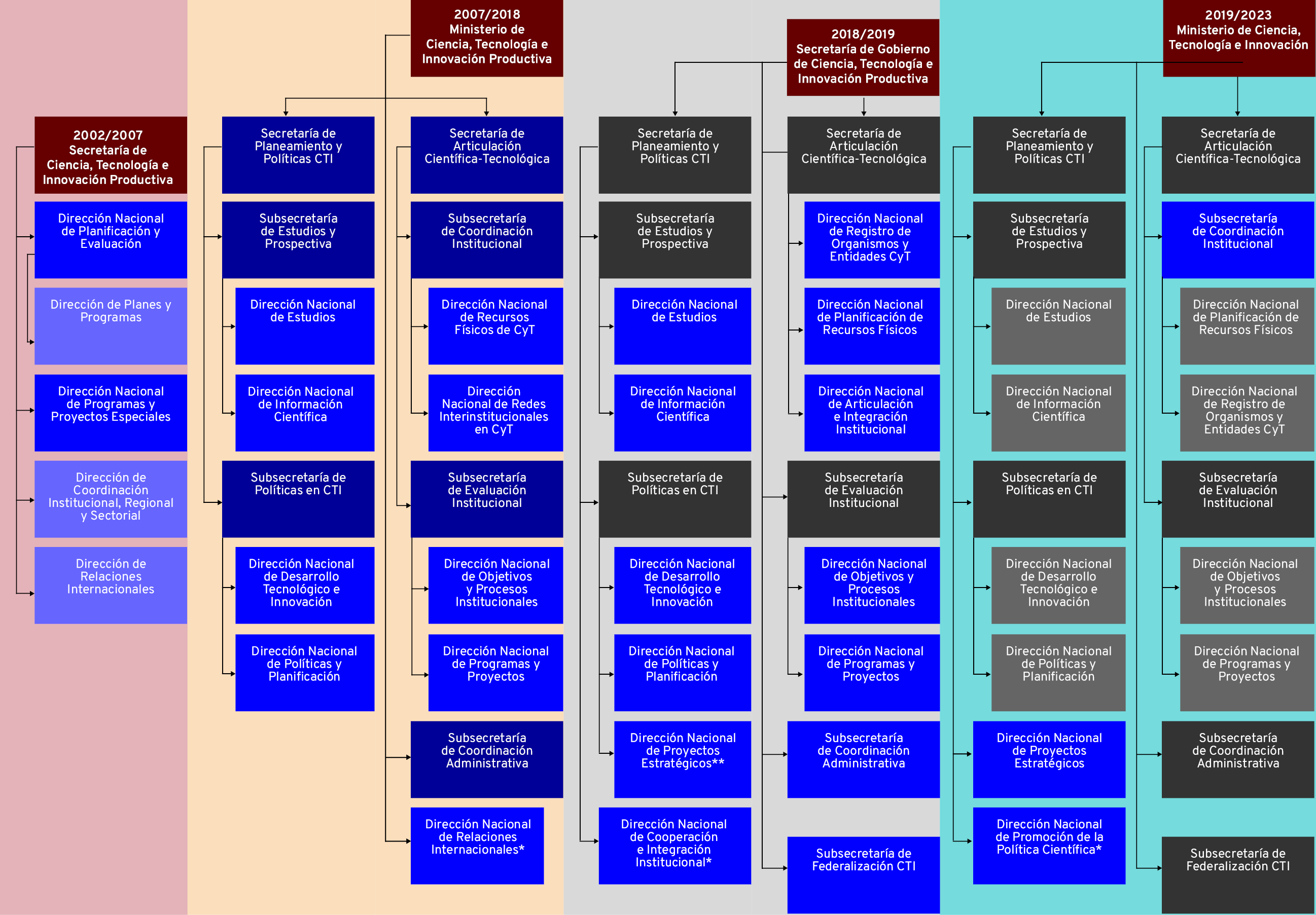 Durante la gestión de Cambiemos se continuaron multiplicando las dependencias de la administración central. En 2016 se creó la Dirección Nacional de Proyectos Estratégicos y en 2018 la Subsecretaría de Federalización de la CTI. Los Proyectos Estratégicos estaban llamados a profundizar la experiencia de los fondos sectoriales, aunque por falta de financiamiento no llegaron a desarrollarse de forma plena. Por su parte, si bien había un organismo destinado a la articulación con las jurisdicciones provinciales (COFECyT), en la Administración central tan solo se contaba con una Dirección de Relaciones con Provincias, Municipios y ONG, de mucho menor rango y creada en 2014. El gráfico 3 muestra el contraste entre la estructura organizativa compacta de la SECyT del año 2002-2007 con la expansión que supuso el MINCyT para todo el período 2007-2023.