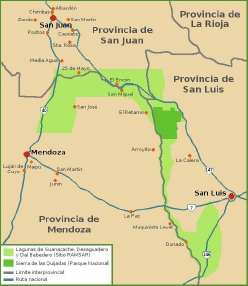 El sistema palustre de Guanacache está conformado por ríos, lagunas y bañados cuyas nacientes de agua provienen de la Cordillera de los Andes. La unión de los ríos Mendoza y San Juan origina este encadenado de lagunas y esteros que se inserta en la cuenca del río Desaguadero hasta las salinas del Bebedero. El sitio Ramsar Lagunas de Guanacache, Desaguadero y del Bebedero abarca 962.370 ha, en territorio del Parque Nacional Sierra de las Quijadas, dependiente de la Administración de Parques Nacionales y de las provincias de Mendoza, San Juan y San Luis. Representa el humedal más extenso de la región de Cuyo: en los períodos de mayor abundancia hídrica llegó a ocupar unos 2.500 km2 de superficie de agua. Sin embargo, desde comienzos del siglo XX un proceso de desecamiento comenzó a afectar el área, el cual se fue agravando con el pasar de los años. Estudios recientes señalan que en el período comprendido entre 1987 y 2018 la pérdida de superficie del humedal fue del 80% (Arancibia Abrahan, 2019).